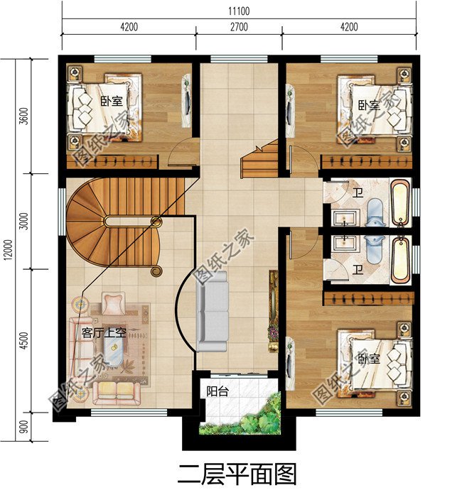 二層戶型:客廳上空、小客廳、臥室(帶衛(wèi)生間衣帽間)、臥室x2、衛(wèi)生間、陽(yáng)臺(tái);注:客廳可做成復(fù)式或者不復(fù)式
