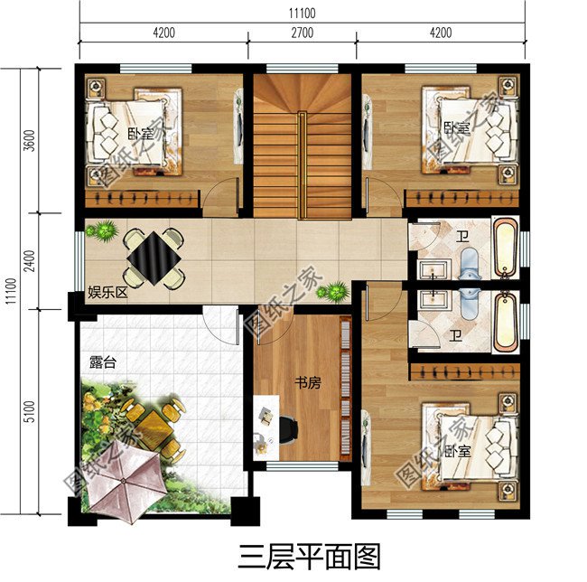 三層戶型:娛樂(lè)區(qū)、臥室(帶衛(wèi)生間)、臥室x2、書房、衛(wèi)生間、露臺(tái);