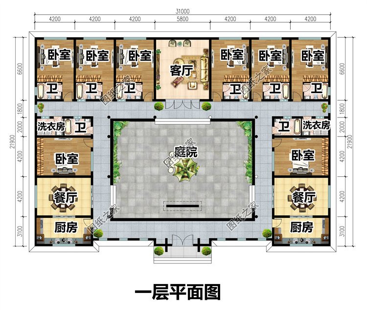 一層(一棟的戶(hù)型):共用客廳、廚房、餐廳、臥室(帶衛(wèi)生間)x3、臥室、洗衣房、衛(wèi)生間;