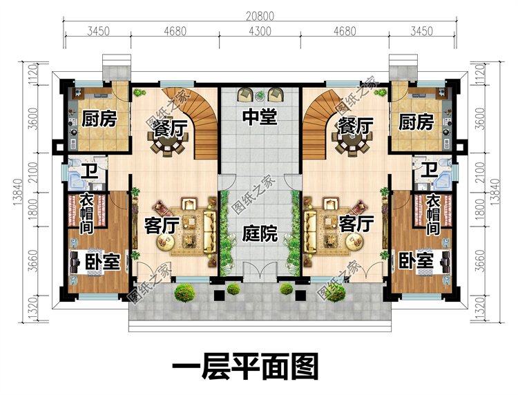 一層:共用庭院中堂、客廳、餐廳、廚房、臥室(帶衣帽間)、衛生間;