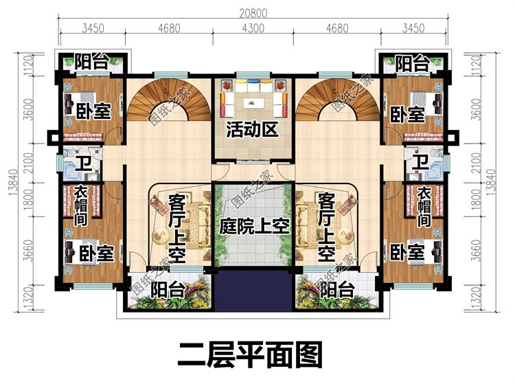 二層:庭院上空、客廳上空、共用活動區、臥室(帶衣帽間)、臥室、衛生間、陽臺;