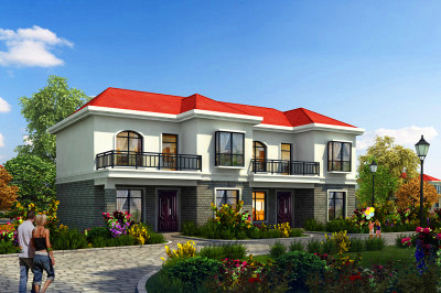 二層雙拼別墅外觀效果圖及施工圖,帶露臺,14乘12米