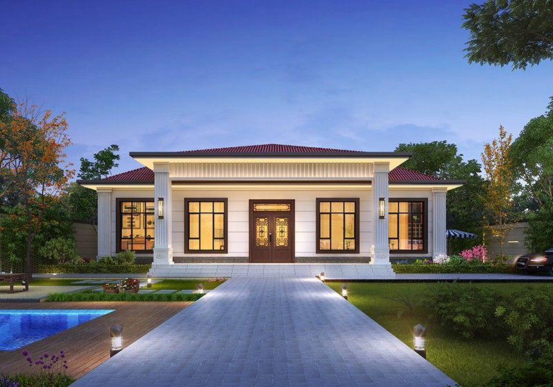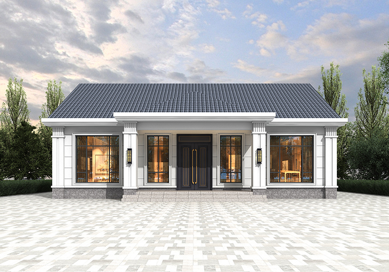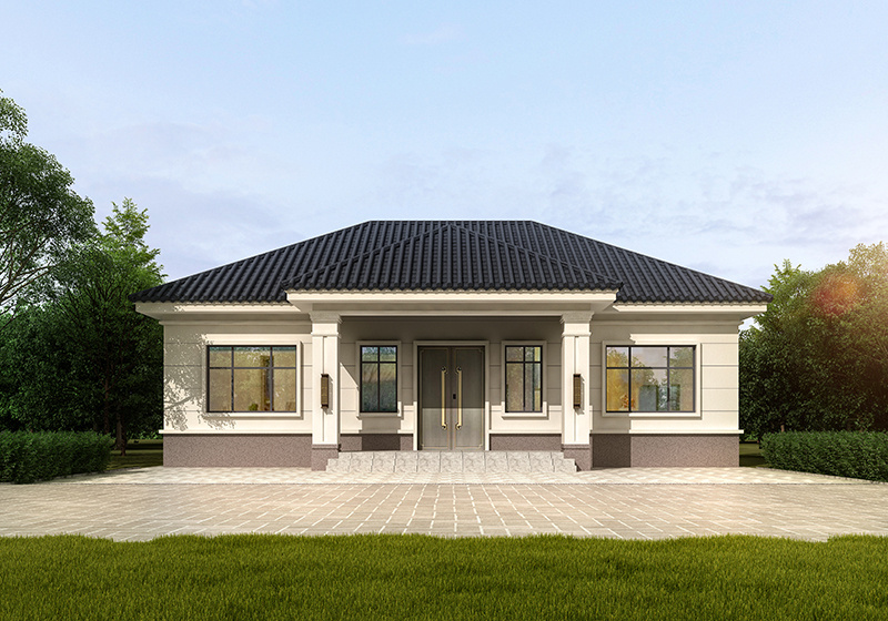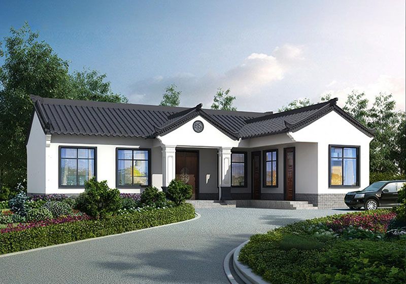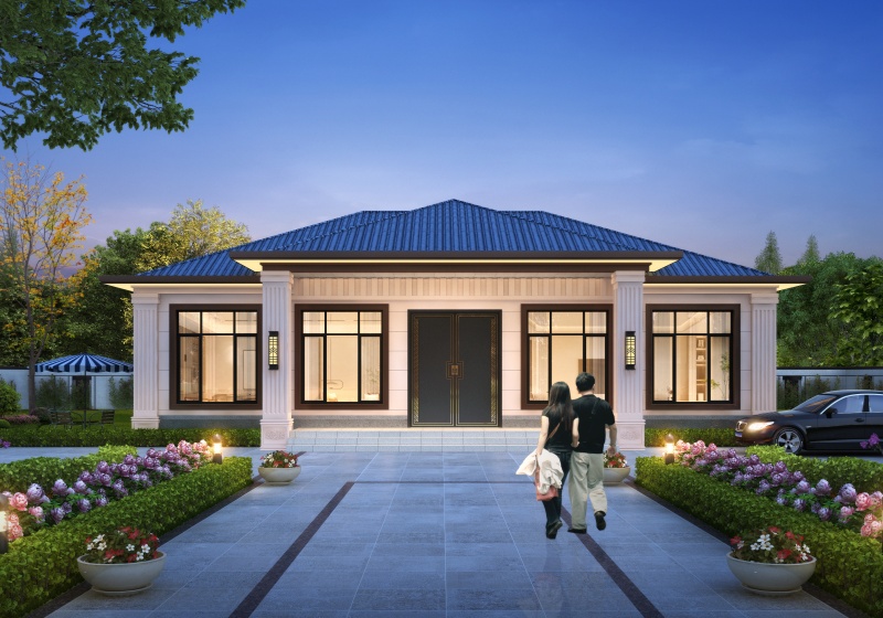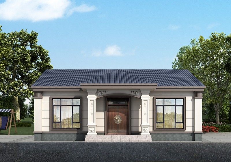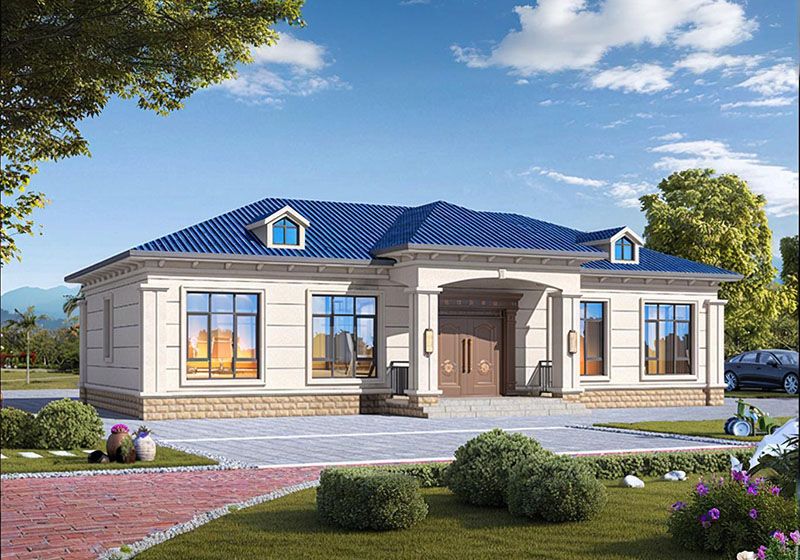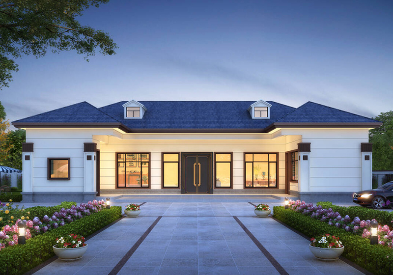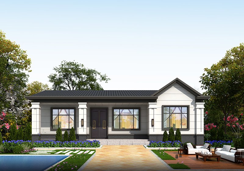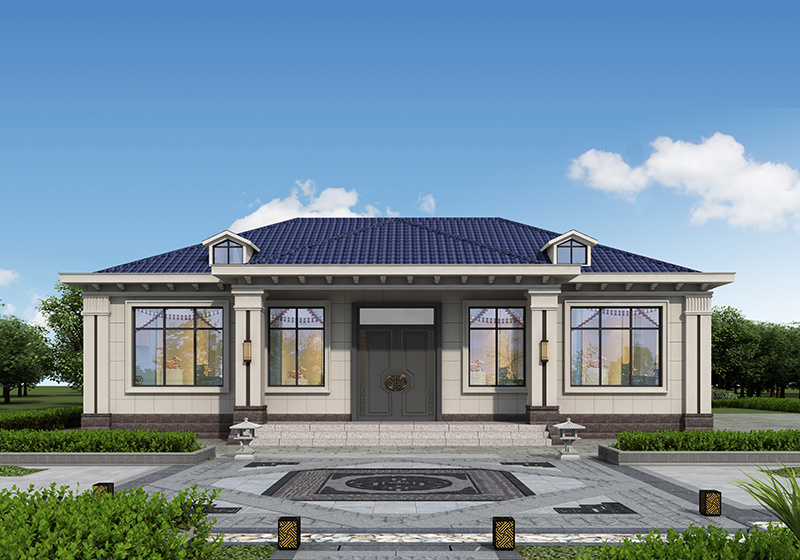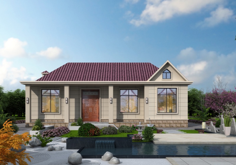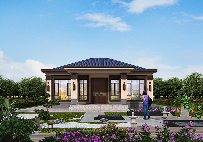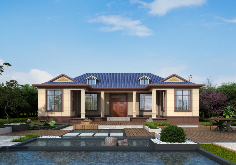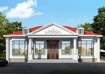 圖紙介紹:現代田園風格一層農村別墅設計圖效果圖,帶閣樓設計,外觀很時尚,沉穩大氣,室內布局也很實用,造價經濟,施工簡單,外立面大氣華麗,大開間門廳上非常有氣勢,室內空間都非常大而注重生活品質,大客廳,大餐廳,大廚房,非常舒適的居家體驗