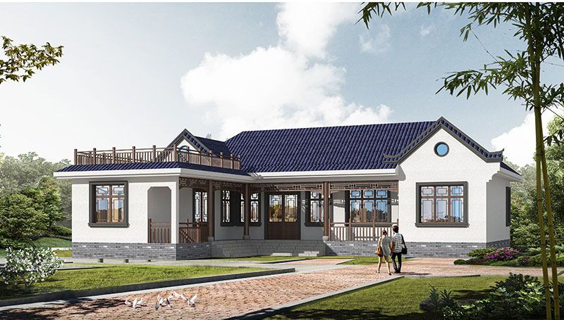 圖紙介紹:中式風(fēng)格一層別墅設(shè)計圖,鳥語花香回家建房,外觀設(shè)計白墻藍瓦,頗有中式韻味,又有著現(xiàn)代簡約因素融入其中,非常大氣。門口非常氣派的門頭,通過朱紅大門進入室內(nèi),大客廳和廚房餐廳呈直線排列,入戶玄關(guān)有墻隔開,方便隱私窺探,南北通透。三間臥室圍繞客廳設(shè)計,車庫設(shè)計在南側(cè),方便出行,兩個衛(wèi)生間公私分明,住在這樣的房子里真的不要太舒服了。