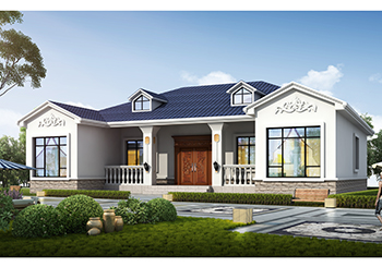 圖紙介紹:誰說一層平房不能是豪宅,這款一層別墅圖真是漂亮又實用,別墅外觀給人一種豪華大氣的感覺,南向正門處設計有門廊,很有入戶儀式感。外觀上左右呈對稱式設計,看起來四平八穩,更顯穩重。米白色真石漆外墻搭配藍色琉璃瓦坡屋頂,色調溫馨舒適。屋頂上的兩個老虎窗不僅可以為閣樓提供采光,在造型上也起到了畫龍點睛的作用。簡潔大氣,很有品味。